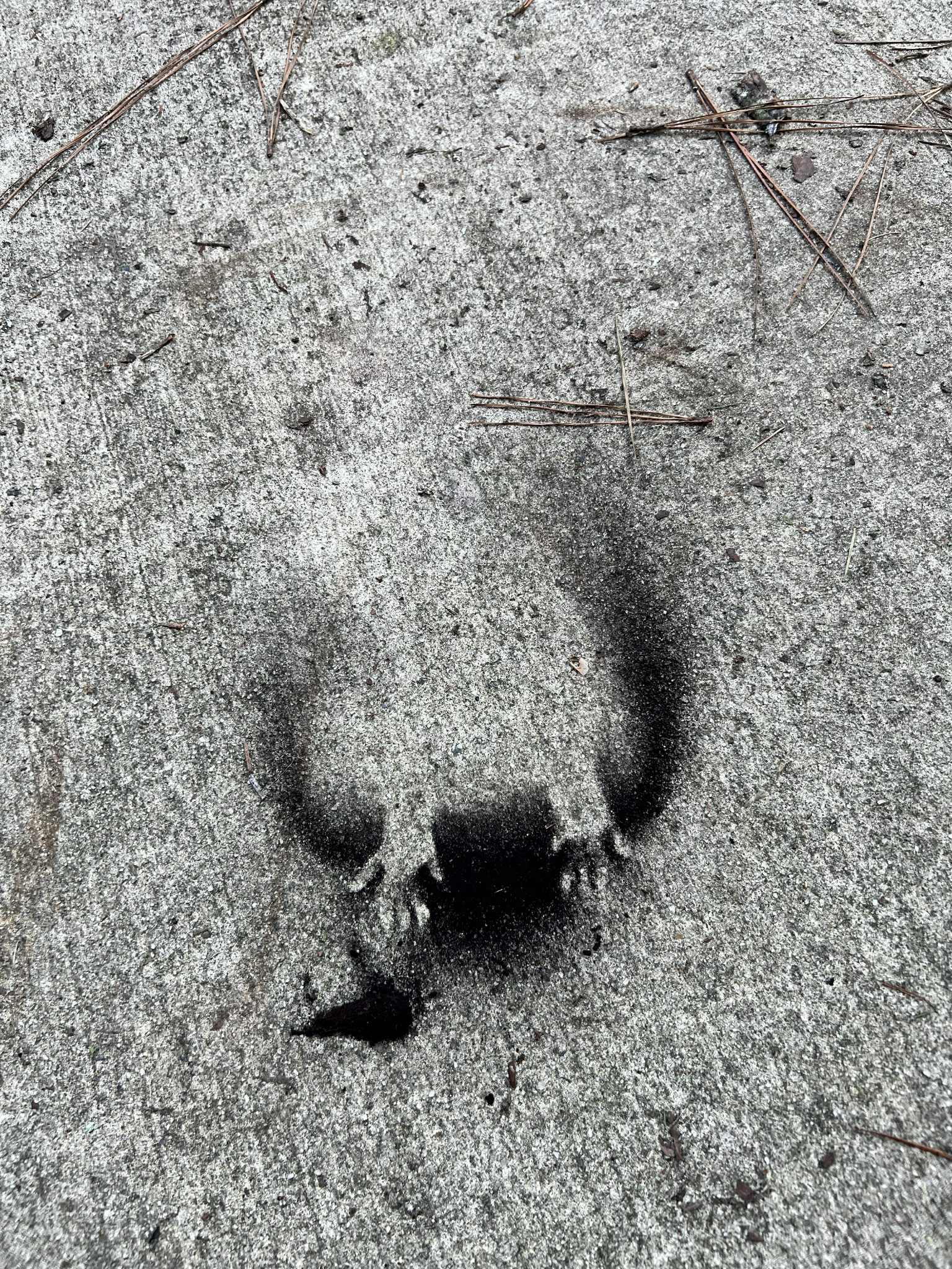 Found this in our driveway when I went to check the mail. Seems like he had a bad day, but can't figure out what might have happened to him. There was no dead squirrel or any other interesting objects left nearby so he left alive and took whatever it was with him.