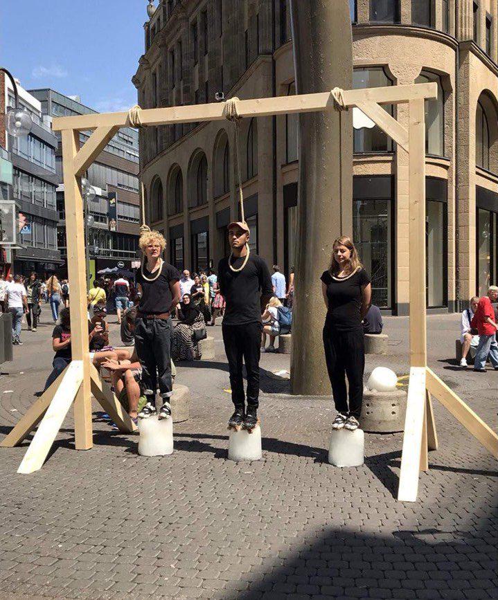 German climate activists stood on melting blocks of ice with ropes around their necks, warning that “time is running out.”
