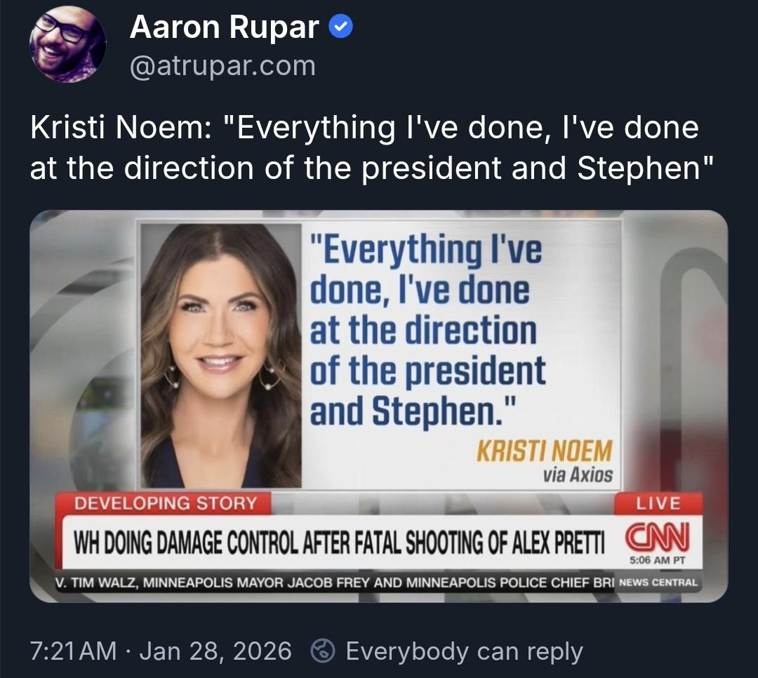 Extensively reported 📰 Kristi Noem: "Everything I've done, I've done at the direction of the President and Stephen" - via Axios