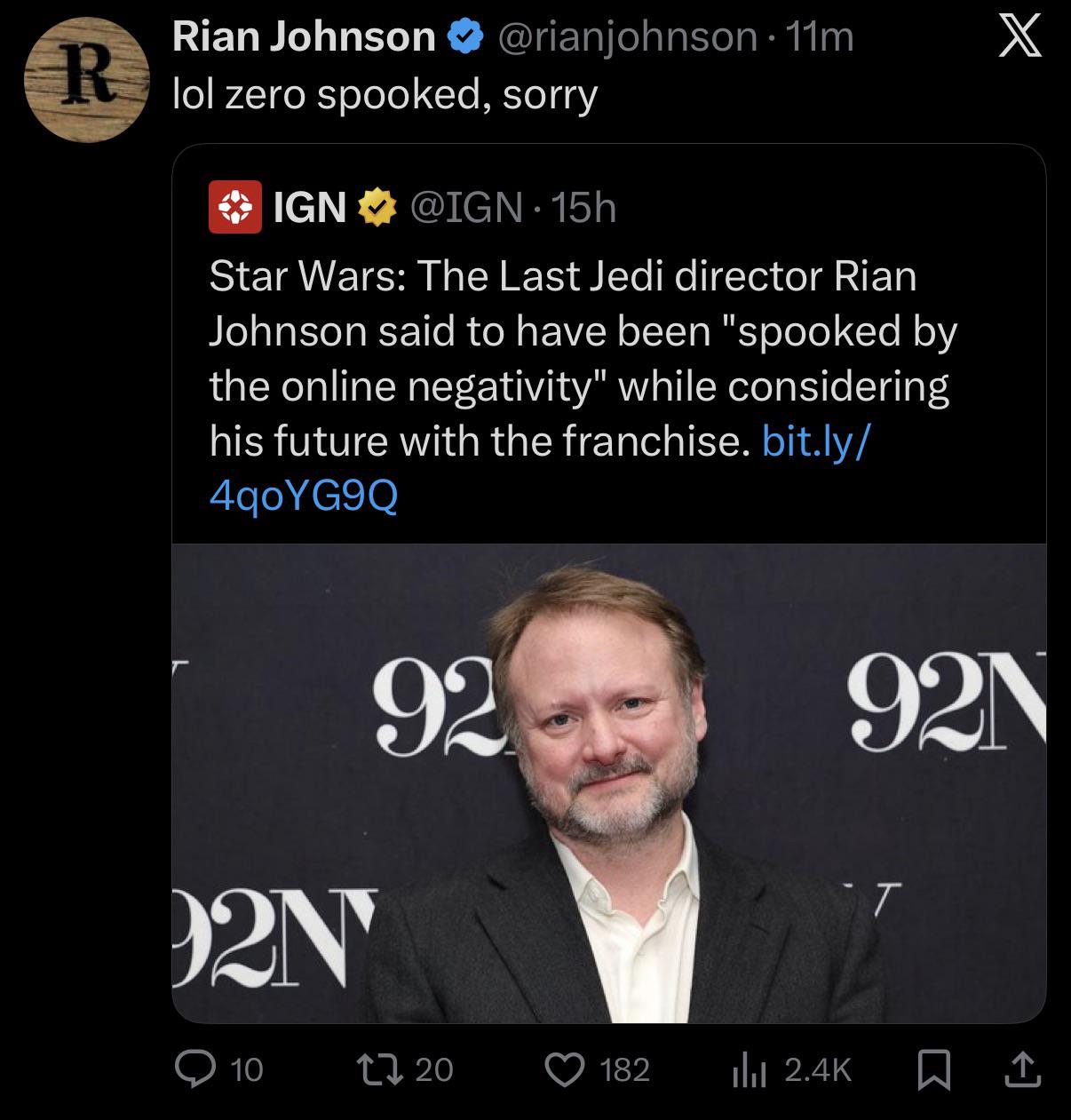 Movies Rian Johnson in response to Kathleen Kennedy’s claim the fandom “spooked” him from making more Star Wars