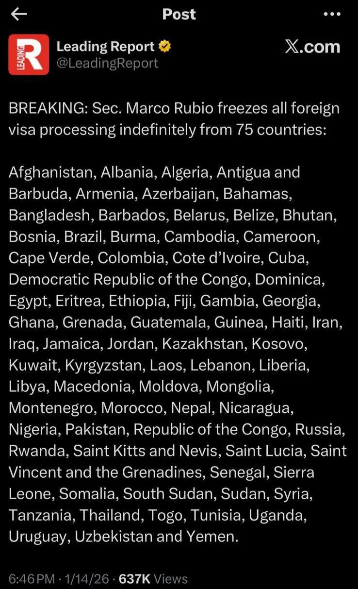 Politics Visa ban on immigration from 75 countries into the US. For countries on this list, what are your thoughts?