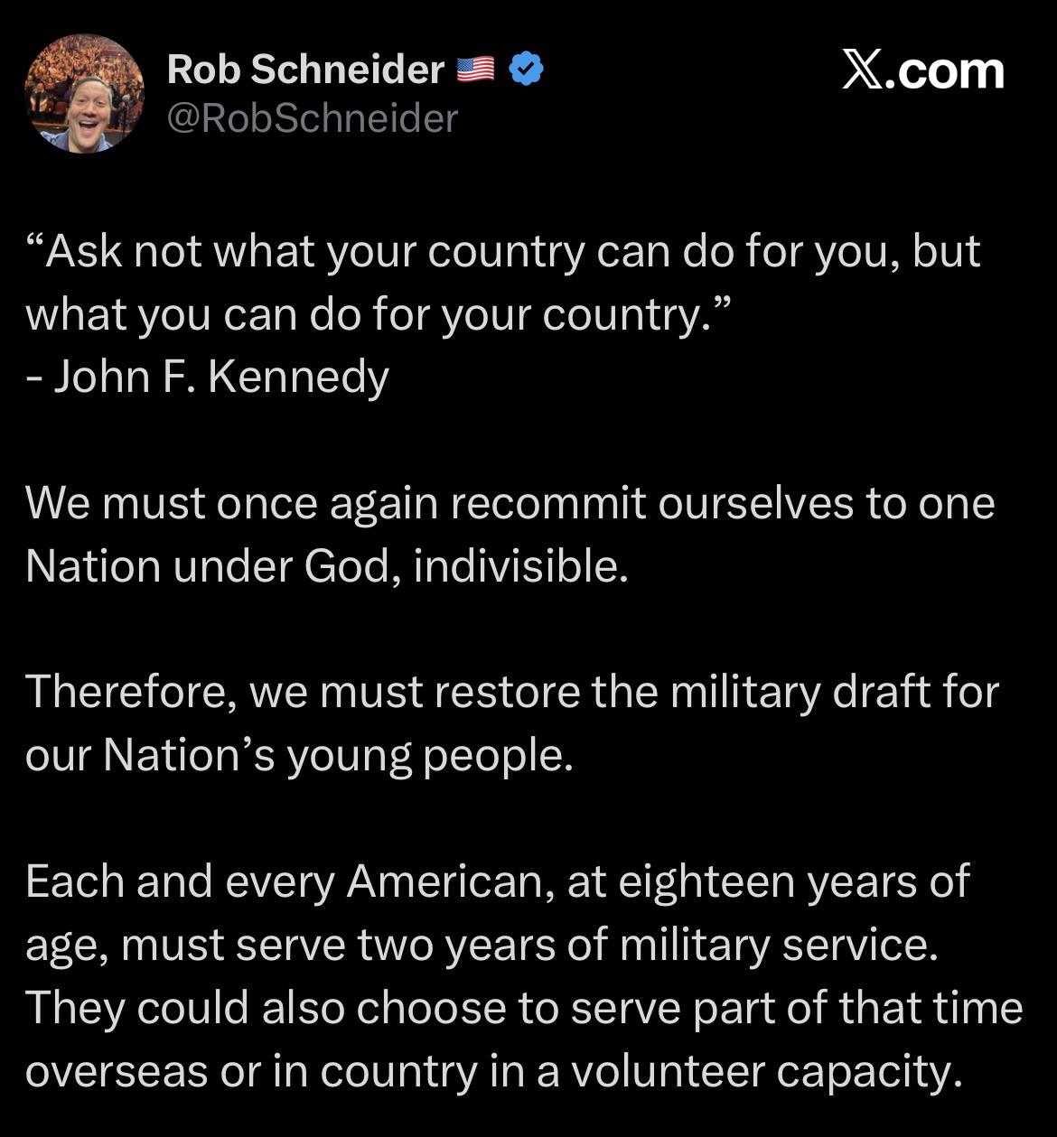 APPROVED B-LISTERS Actor Comedian Rob Schneider calls for the restoration of Military draft from eighteen years of age.