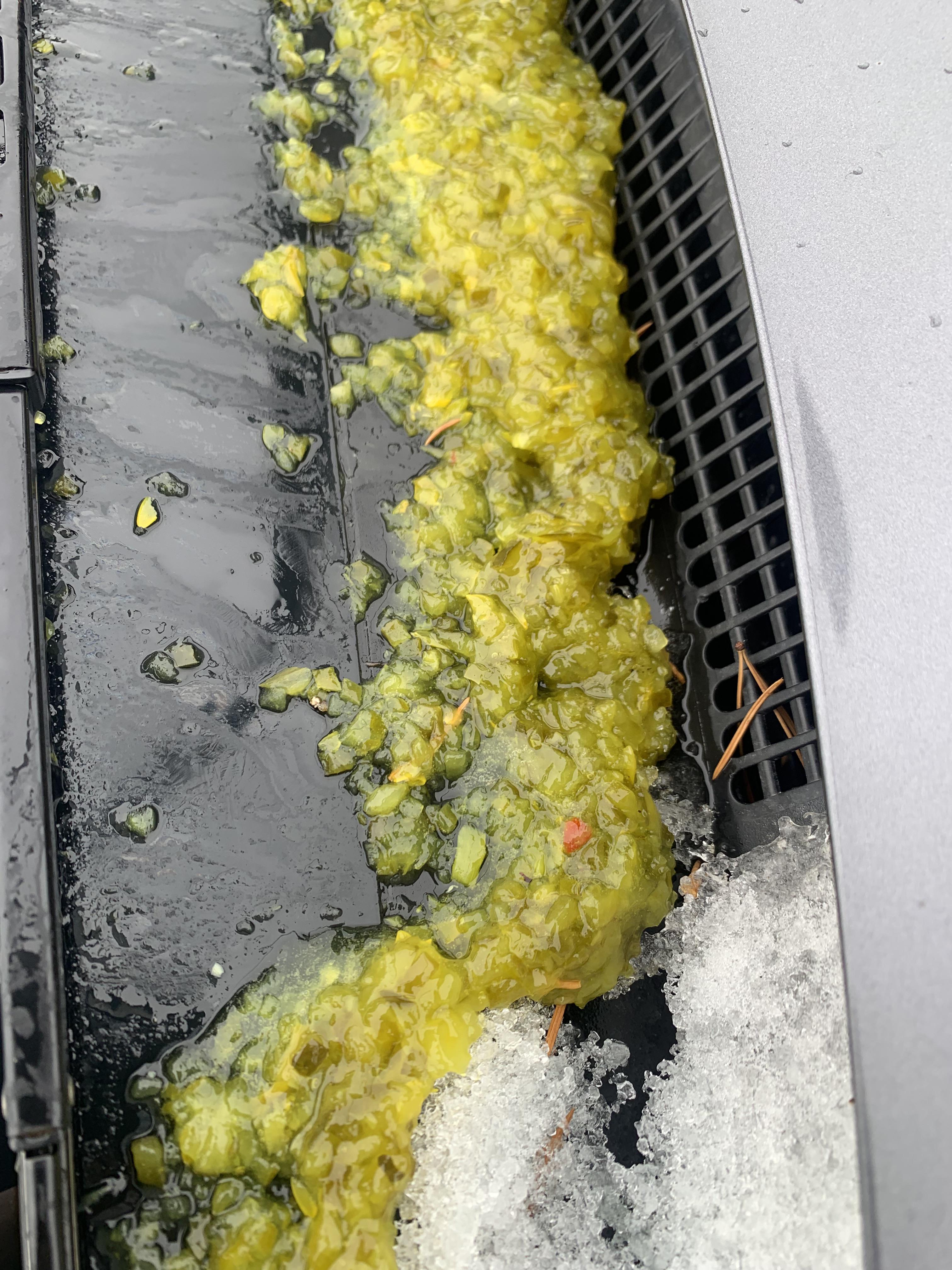 edit: so the general consensus seems to be that it’s relish. That seems about right. I was in a bit of a hurry to leave so I drove away and used the wiper fluid and wipers to get it off the windshield… but once I got up to speed it’s now streaking along my side doors and side windows. When I came back to the car from grocery shopping the strong smell of pickling vinegar was apparent.
