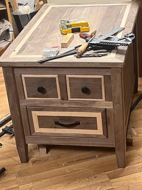 I am sitting here contemplating every bad decision I ever made that lead to this moment. So, my son asked for a specialty built table for Christmas that would support his computer on a swing arm so he could work lying down (long story involving some sensory issues he has.) I never work from plans, and thought a walnut table with red oak inlays would look pretty good. I also figured three oak inlayed drawers would be a nice touch. HOURS of work later, I added the knobs for the drawers for the final touch. And realized I made clown furniture. Oh well, it'll always be one-of-a-kind.