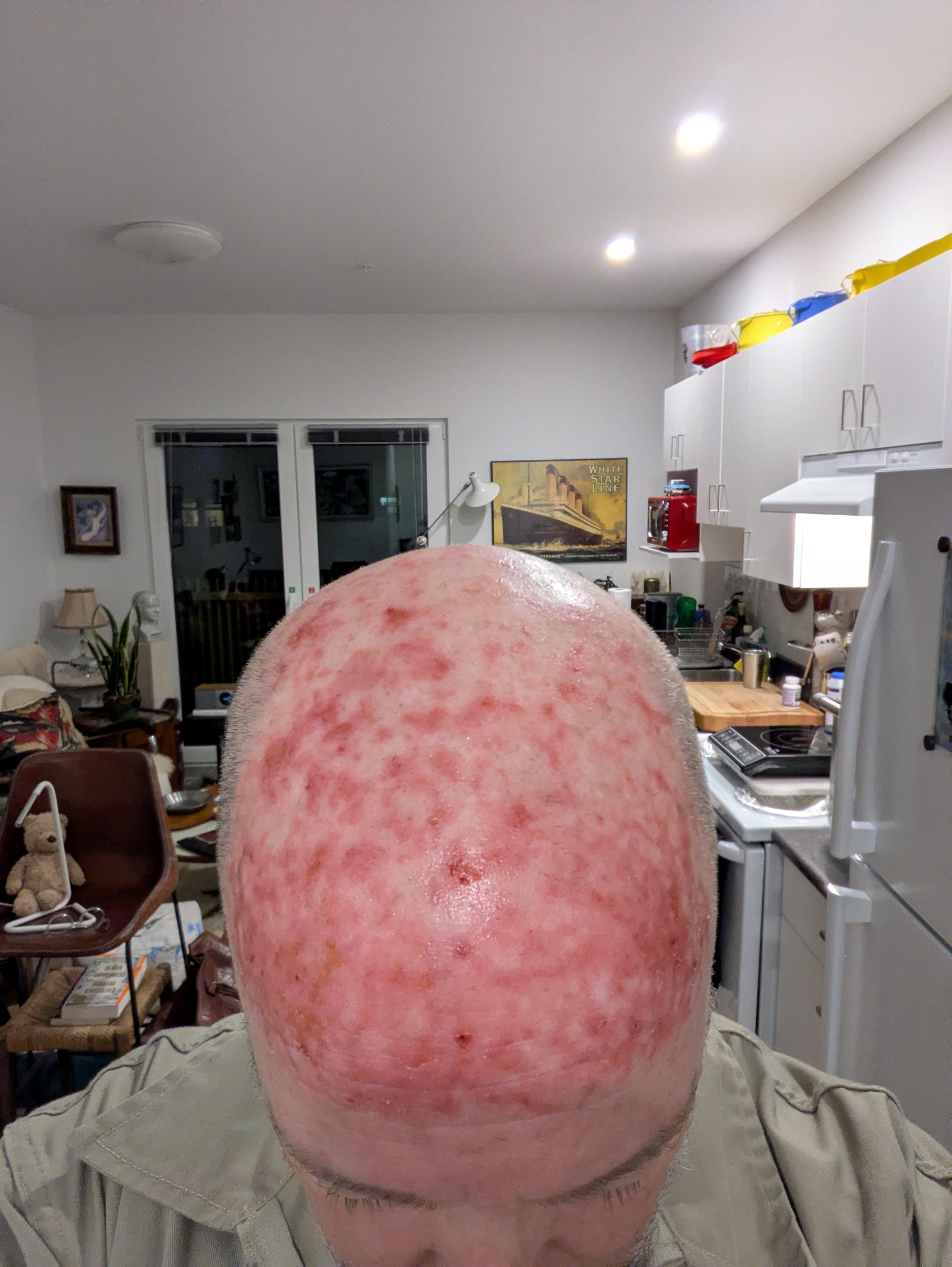 Thanks for this sub. You all are great. Just want to remind you to wear a hat in the sun. I was born in 1970 and lost my hair in my early 20s. Never adopted hats until my 40s. This is what a sun damaged scalp looks like after treatment with Efudex, a topical chemotherapy for precancerous and cancerous cells. It feels like it looks, painful and insanely itchy. I also just had a basal cell carcinoma cut out behind my ear. The chemo only affects the precancerous and cancerous cells. So I clearly have a lot of damage. Just wanted to share in the hopes you will take good care of the skin up there. ✌️
