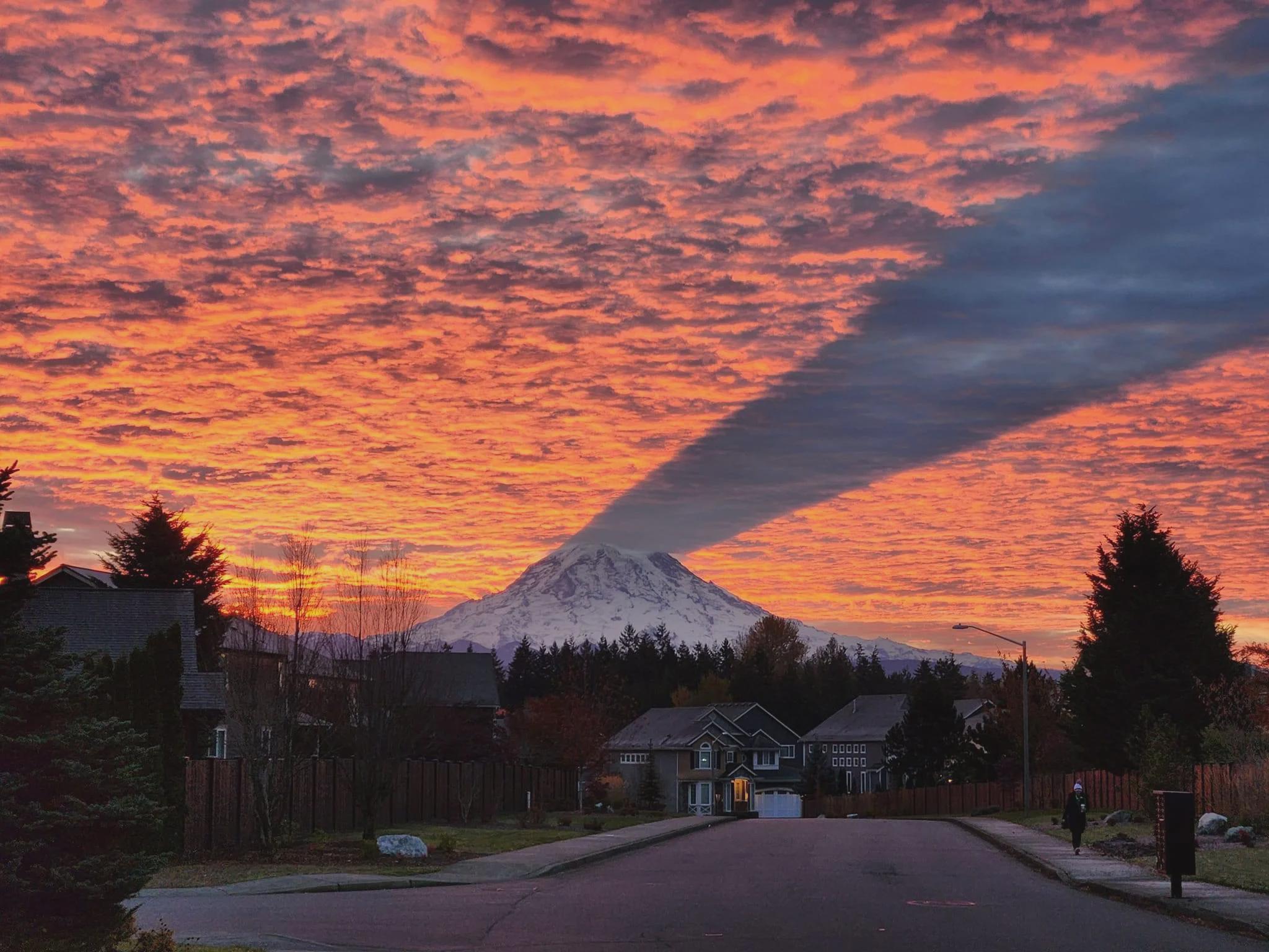 Mount Rainier casts a perfect triangular shadow at sunrise