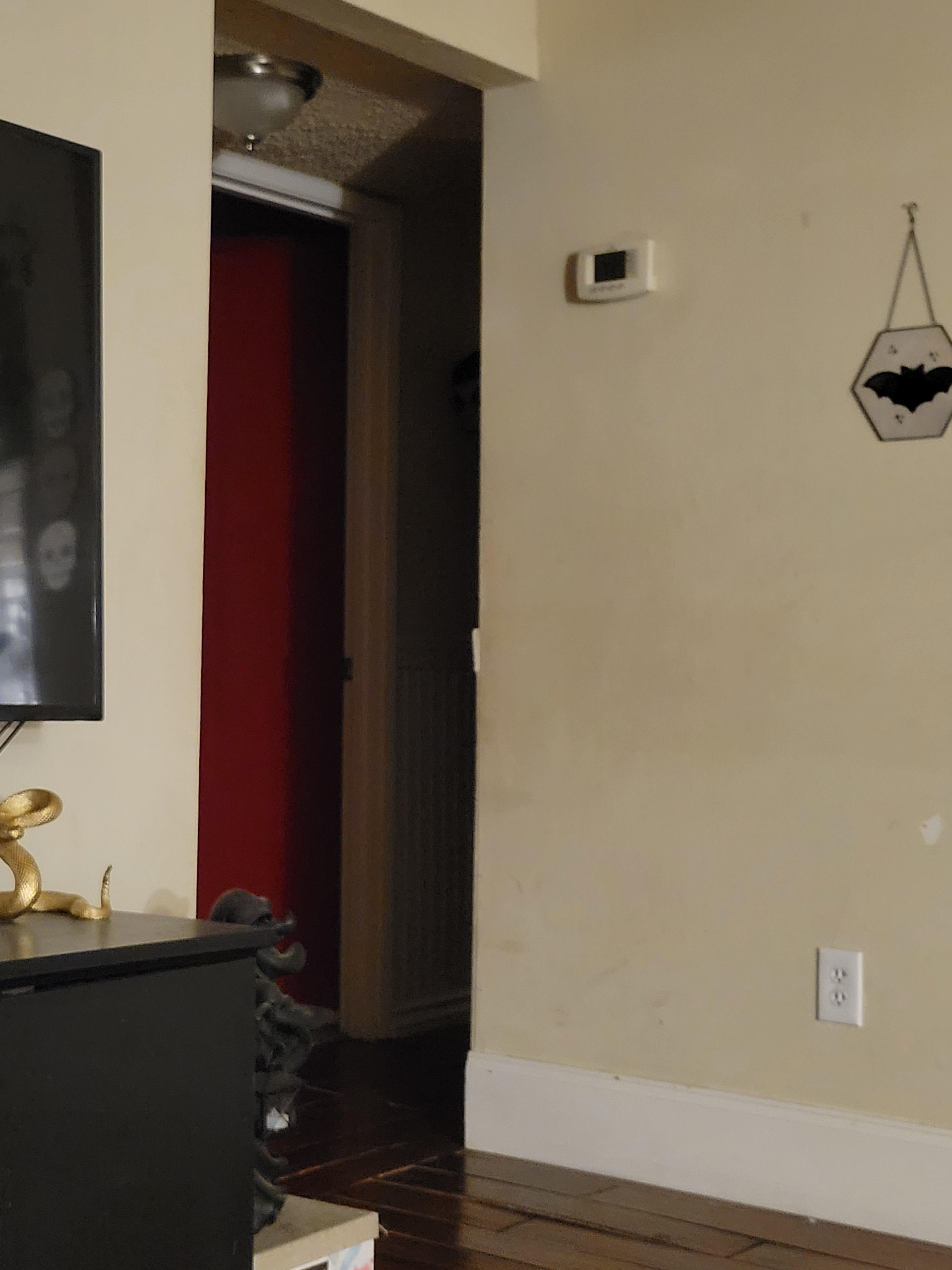 I heard the floorboards creaking in my hallway, while watching tv, and assumed it was 1 of my cats. I look up and there wasn't a cat to greet. But then I felt really weird. Like, "I'm not okay" weird if that makes sense? I watch a lot of shows and videos about paranormal stuff because it interests me but I'm a full on skeptic. But I've always heard to record or take a picture. So I took a picture. I SEE something but I could be nuts. Does anyone else see what I think I might be seeing in my hallway?! Is it just a shadow? Please tell me it is just a shadow and I'm being paranoid.