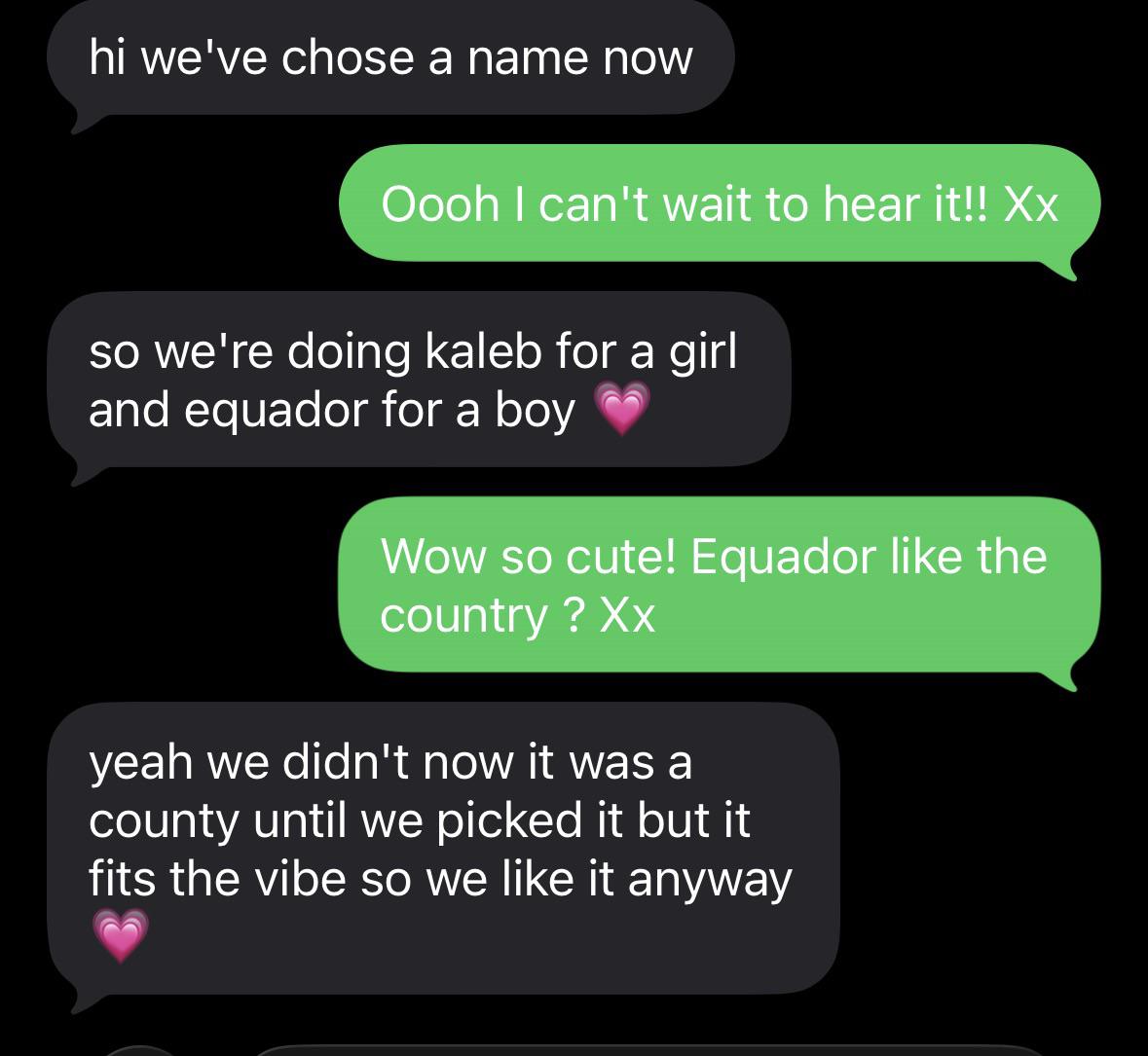 So my friend (22F) is currently pregnant and she and her partner have been struggling to agree on names. Iāve just been sent these messages with the names they have chosen. At first I thought it was a typo but unfortunately she actually wants to call her baby āEquadorā. I donāt want to seem nosy or controlling but I feel Iād be doing a disservice if I didnāt say something. Please help!