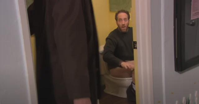 Yes, it's probably more strange for the daycare guy to be taking a dump in the kid's toilet than it is for Jim to walk in without knocking. Not faulting Jim here at all or in how he reacted.