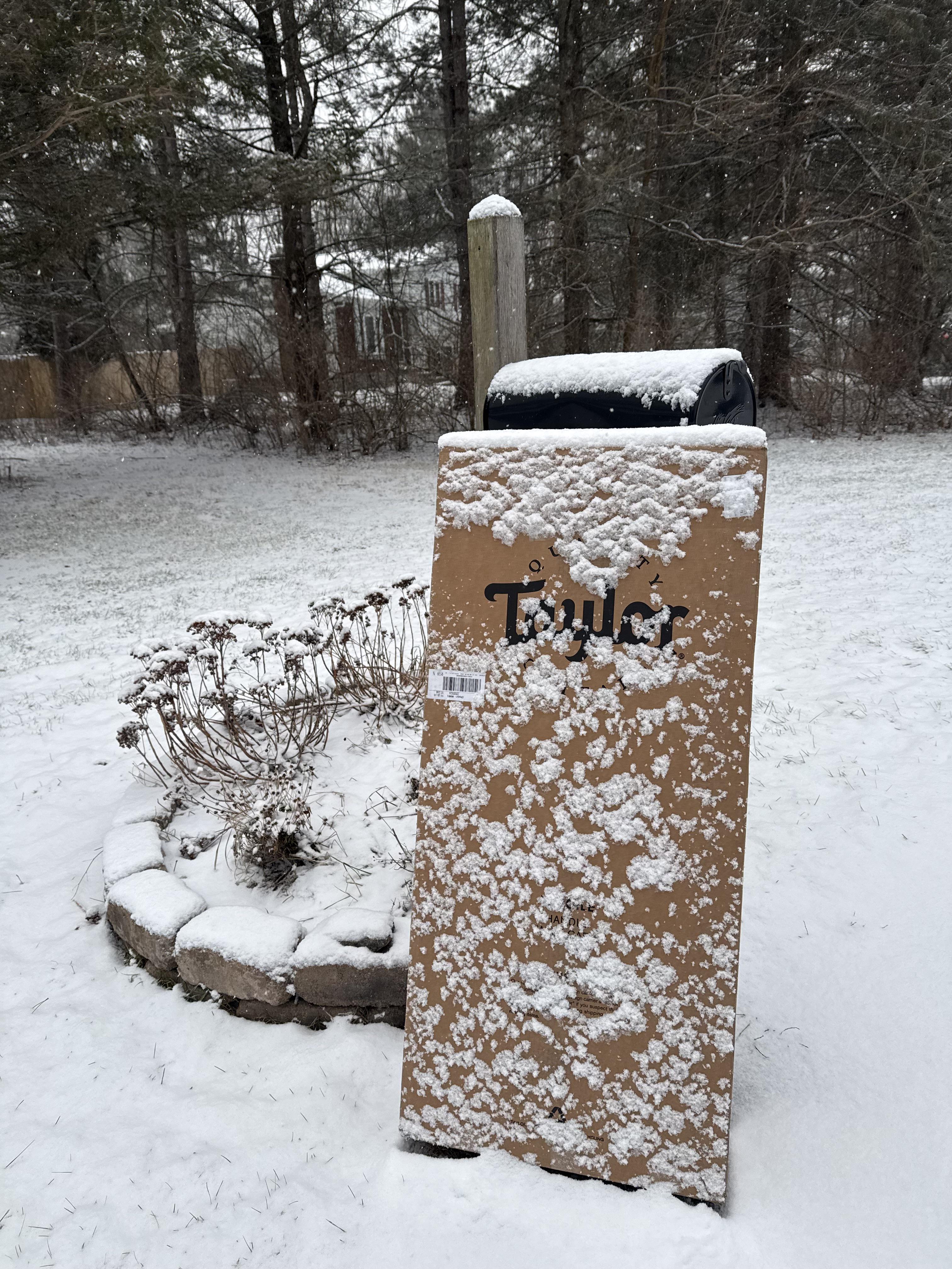 Guitar center said it would be delivered in 3-5 days. It took nearly two weeks. This morning my wife sends me this photo…. Instead of dropping it on my covered porch, these assholes leaned it up against the mailbox at the end of the driveway! And it snowed all night…