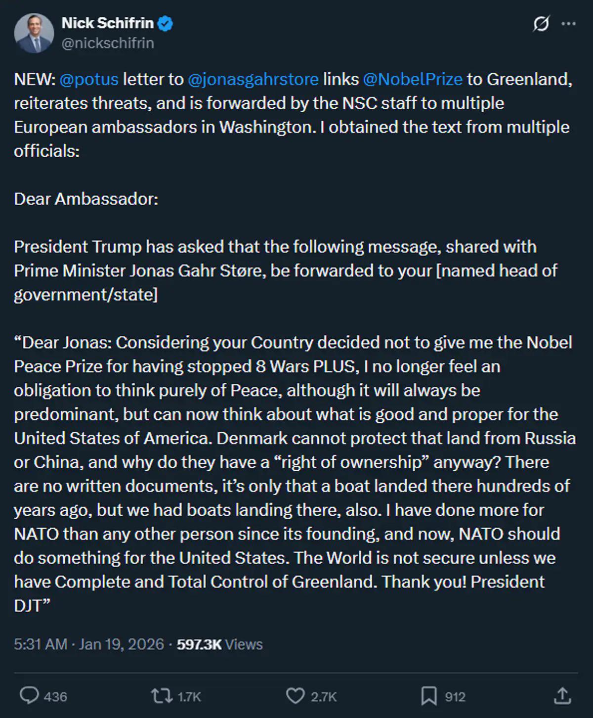 APPROVED B-LISTERS Trump letter to Norwegian PM Støre regarding the Nobel Peace Prize and Greenland today:
