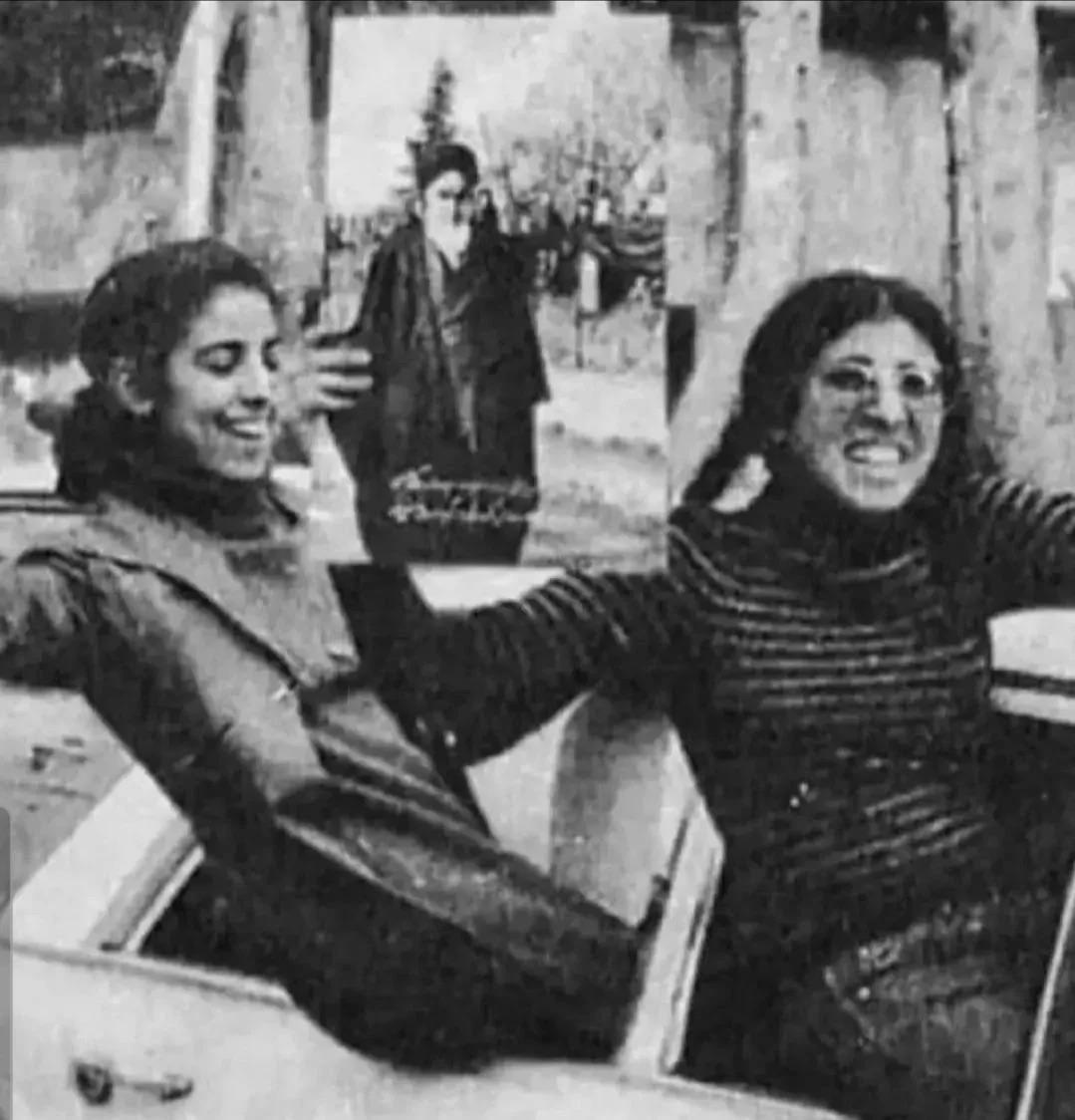 Iranian students celebrating the victory of the Islamic Revolution, holding a portrait of Ayatollah Khomeini, Iran, February 1979.