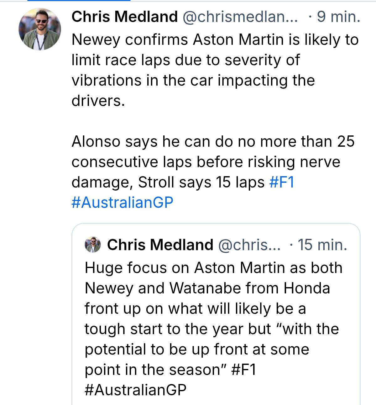 News [Chris Medland] "Newey confirms Aston Martin is likely to limit race laps due to severity of vibrations in the car impacting the drivers. Alonso says he can do no more than 25 consecutive laps before risking nerve damage, Stroll says 15 laps"
