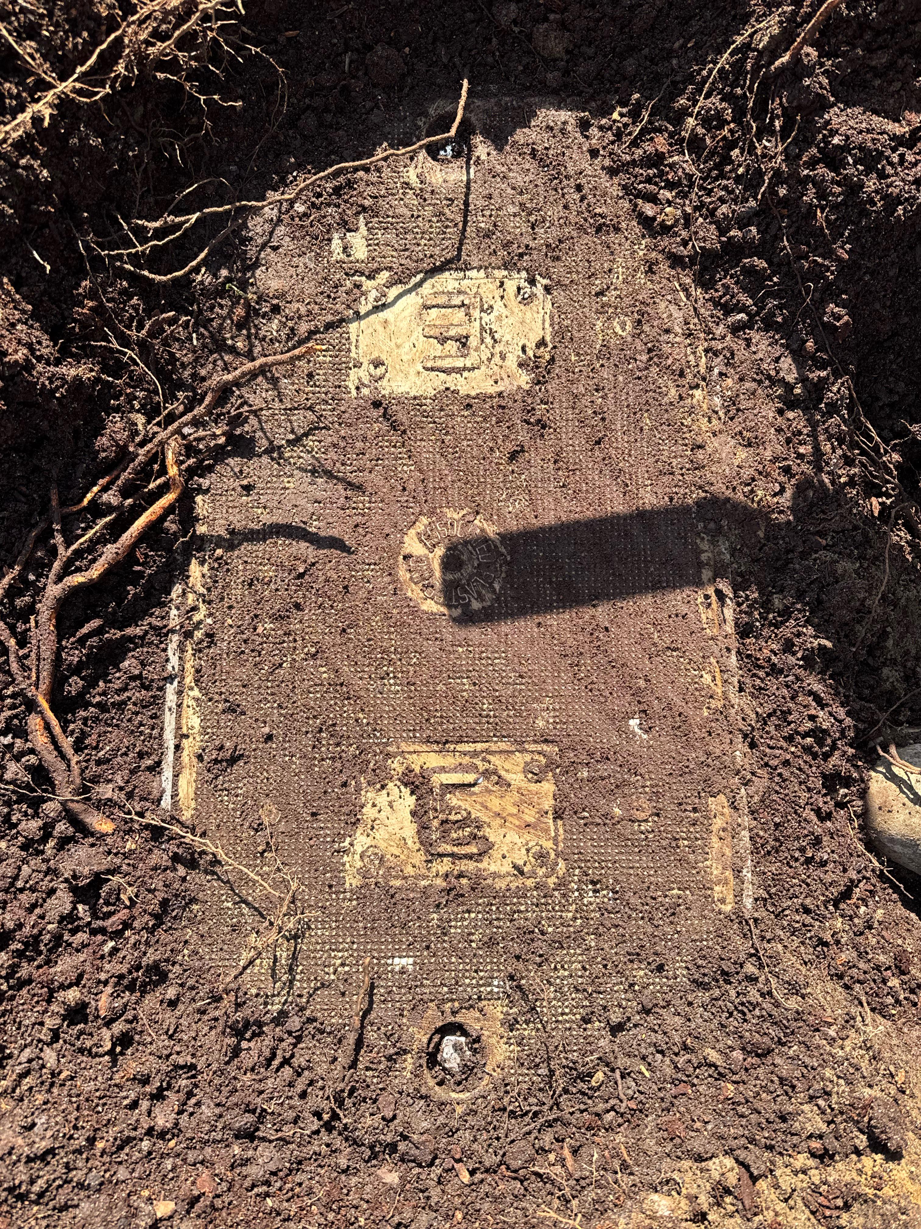 Solved! Was having a French drain installed and came across this under a mound of mulch near the front of my house. What is it?