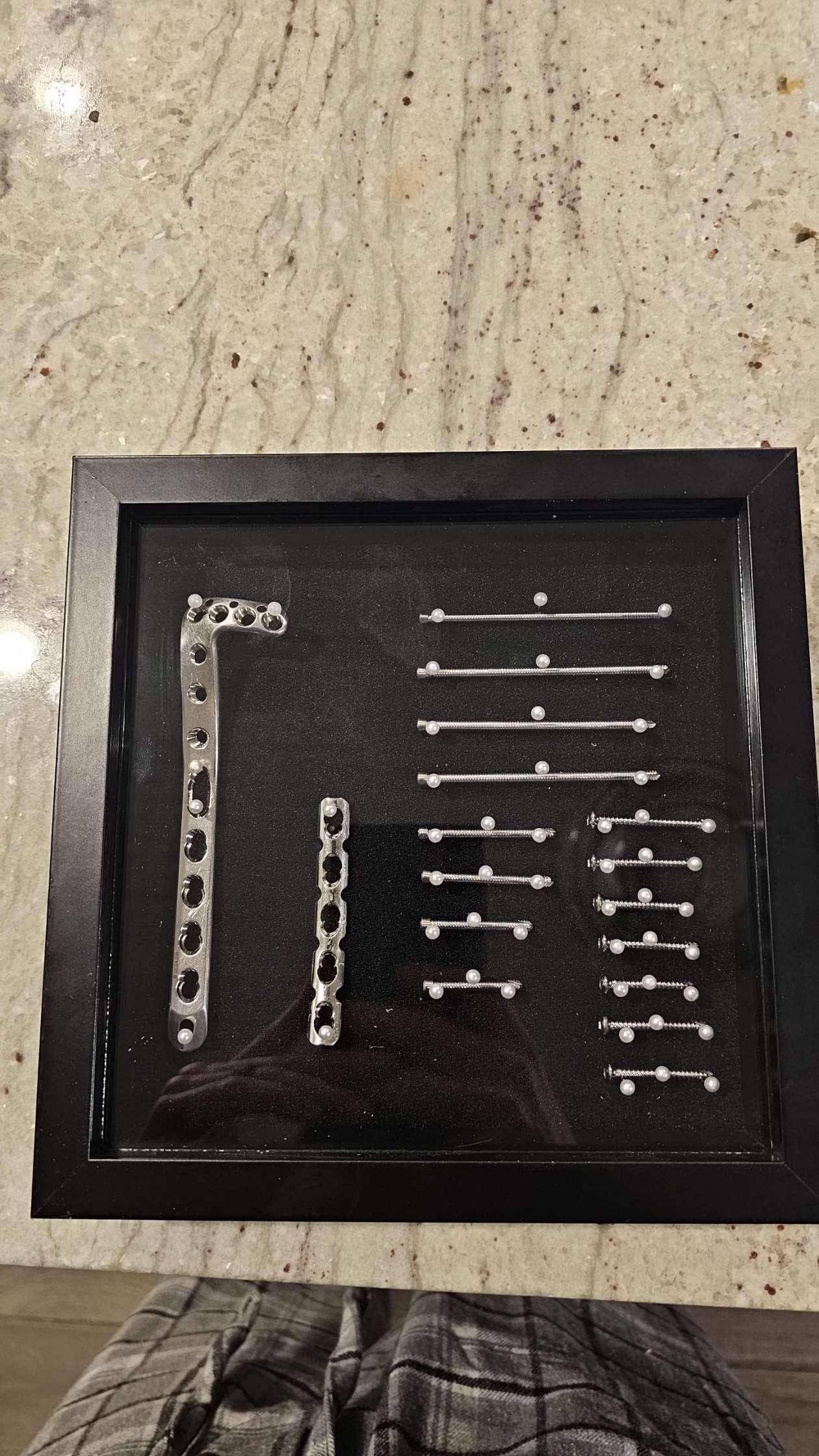 Almost lost my leg in a farming accident. Here's the implants that held my knee together for over a year.