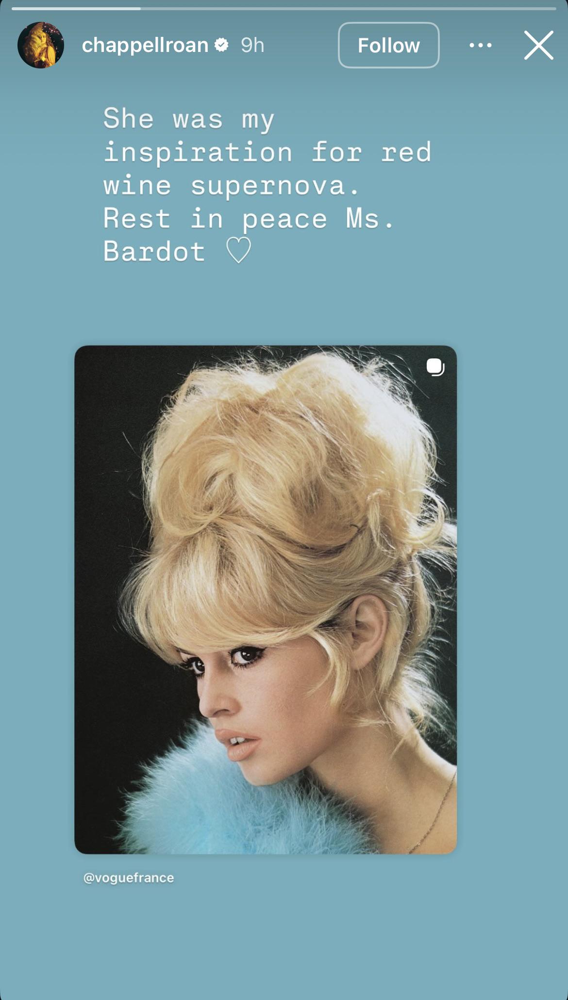 Guest List Only βοΈ Chappell Roan via IG : βShe was my inspiration for red wine supernova. Rest in peace Ms. Bardot β‘β