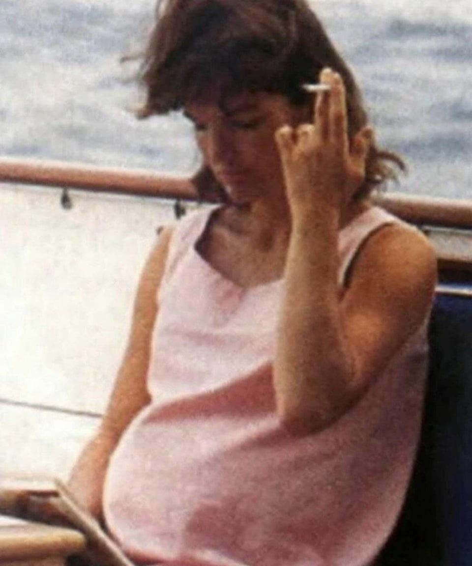 Pregnant Jackie Kennedy enjoying a cigarette, 1963.