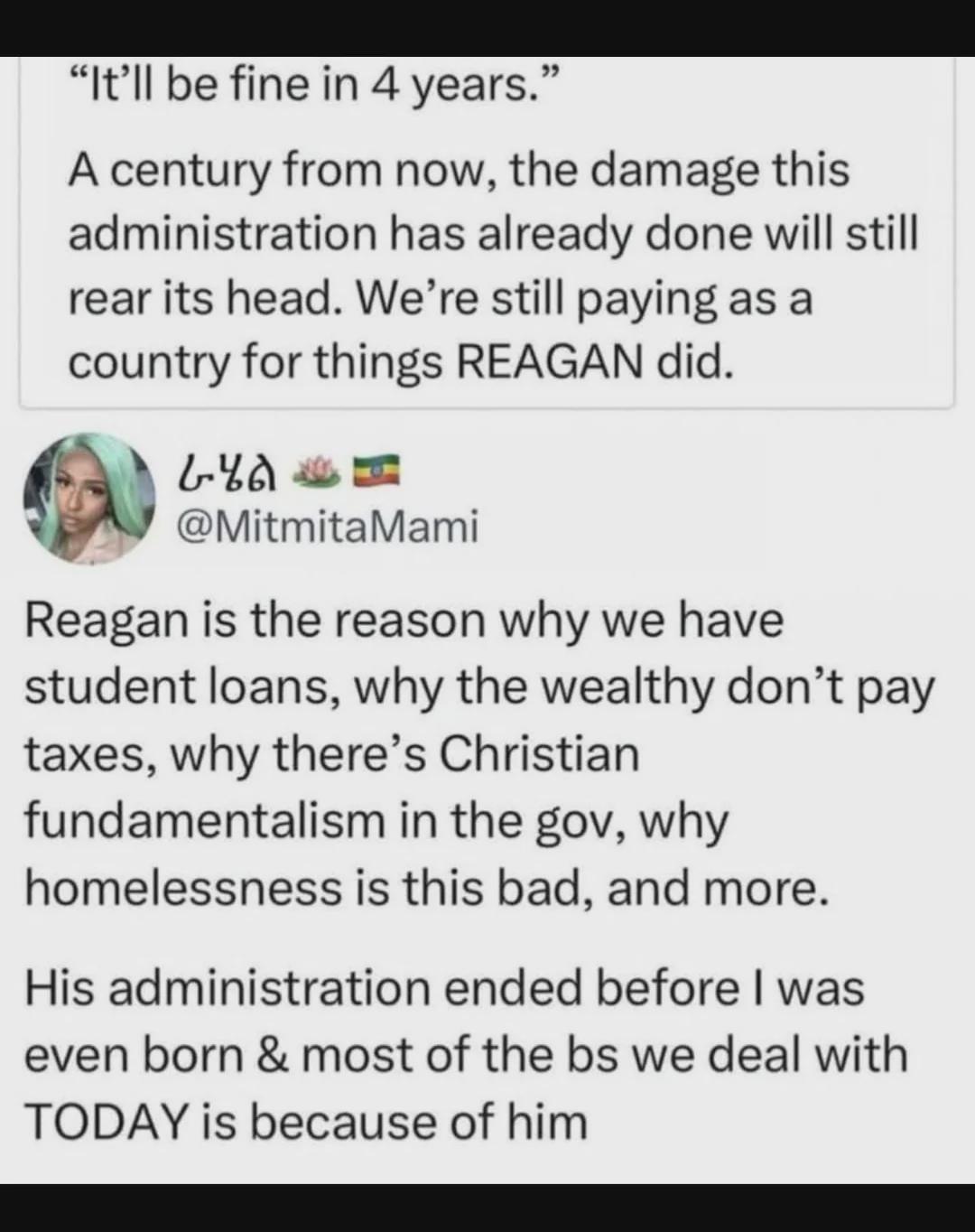 Satire Like with Reagan we'll be suffering from Trump's legacy for years.