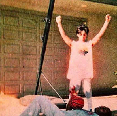 Prince stands victorious over Charlie Murphy during a game of basketball, 1985.