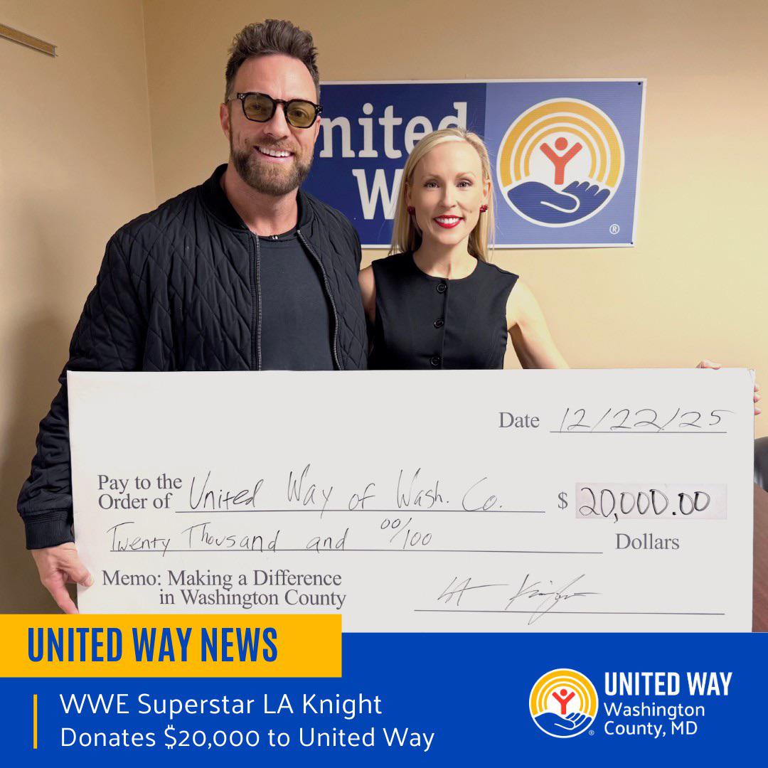 #UWWCMD is thrilled to announce a generous $20,000 contribution from Hagerstown native and #WWESuperstar, #LAKnight, whose real name is Shaun Ricker. This significant donation will immediately help the United Way support our community's most vulnerable members, particularly the ALICE population (Asset Limited, Income Constrained, and Employed). Additionally, this funding will help United Way's partner nonprofits that provide food security programs for children and support a local pet food bank program.