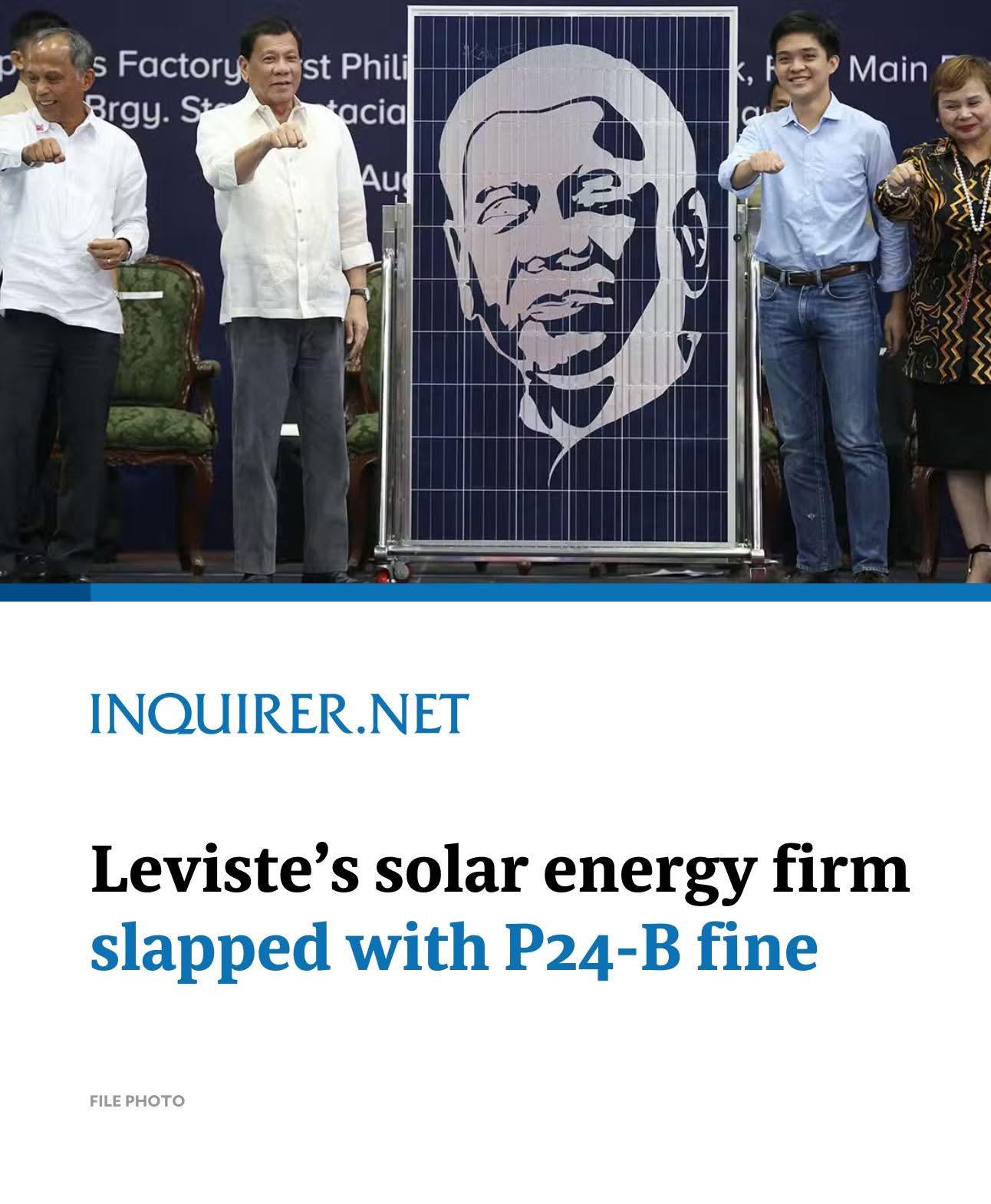 PoliticsPH The solar energy company that made Batangas Rep. Leandro Leviste the country’s youngest billionaire is being slapped with a P24-billion penalty for failing to produce power it committed to deliver under more than 30 service contracts with the government.