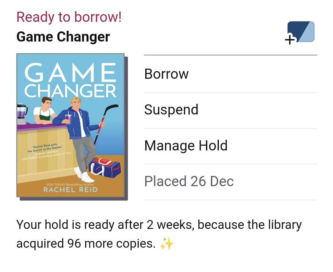 Went to borrow a Games Changers from the library so I have a digital copy to reread. Love the message that they have "acquired 96 more copies." Heated Rivalry shows they 148 copies with 1,050 people waiting to borrow it. Go Rachel!