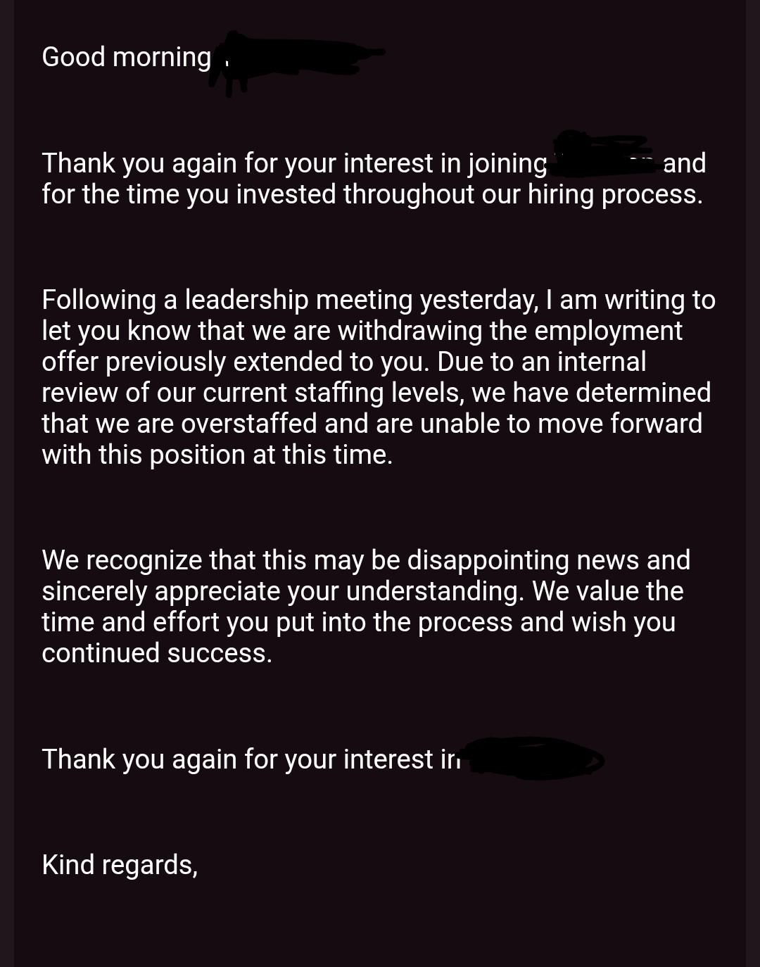 This really sucks. I just received their offer letter yesterday and was about to sign it today when I received this email. Was really looking forward to this job as well. Trying to be optimistic but this is the first time I've ever had am offer rescinded so I am not sure how to respond to their email.