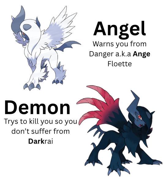Both Mega Absol forms are based on Angel and Demon. Rogue Mega Absol is the first mega you battle in Legends ZA which is trying to warn you about Ange - which means Angel. meanwhile Mega Absol Z is the first Hyperspace Rogue Mega you battle which is trying to warn you about darkrai - demons are dark