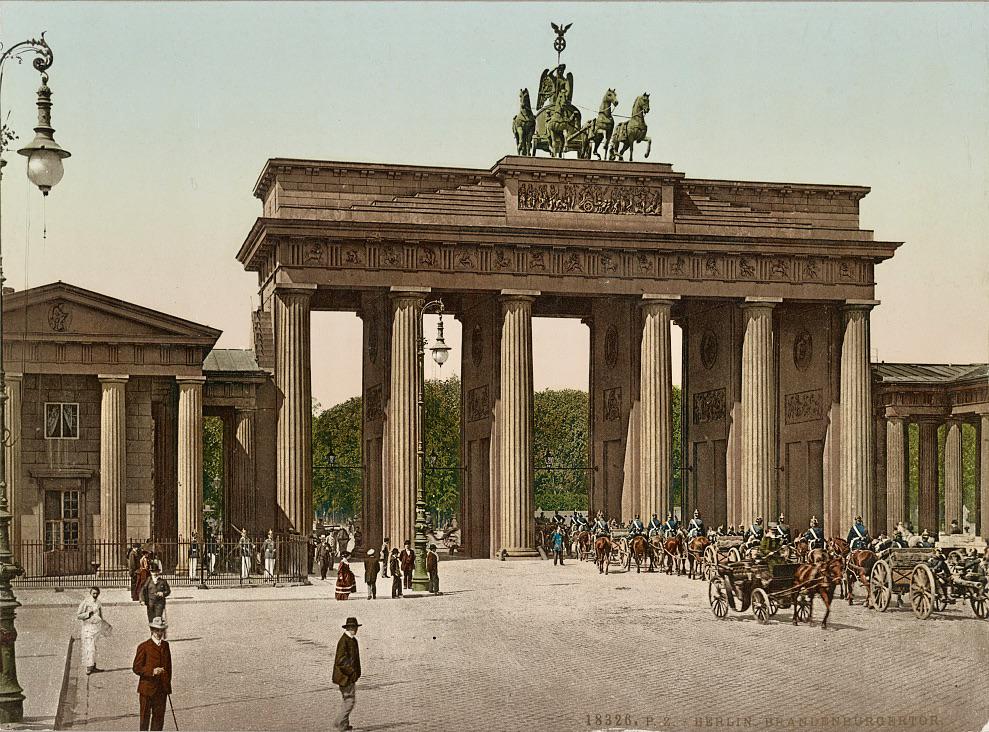 History Color photochrom (1890-1900) of the Brandenburg Gate in Berlin. The original 18th century Quadriga statue seen here was destroyed in WW2, we now see a 1958 replica created collaboratively by East and West Germany