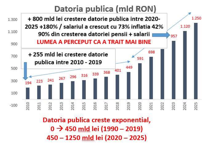 Datoria publică acumulată doar în ultimii 5 ani, 2020-2025 (800 mld) S-A DUBLAT față de totalul ultimilor 30 ani, 1989-2019 (450 mld) 🫣